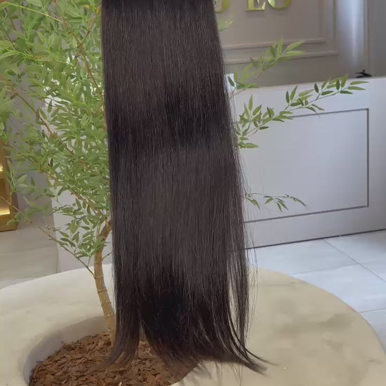 Cabelo virgem e livre de químicas, no tom de castanho escuro natural, com textura macia e brilho sutil. Ideal para quem prefere um visual clássico e atemporal.